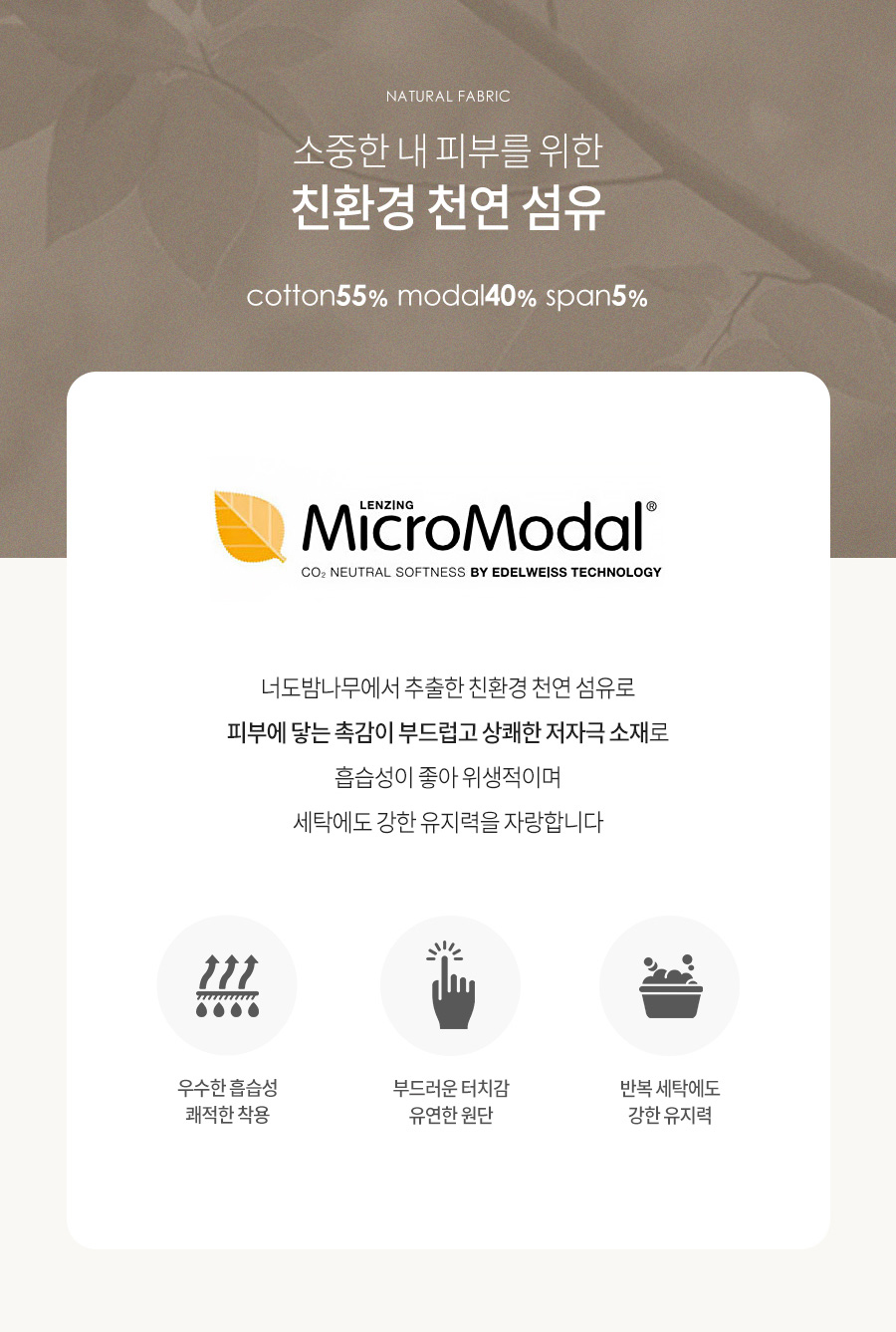 Fabric : 코튼55 / 모달40 / 스판5 (%)