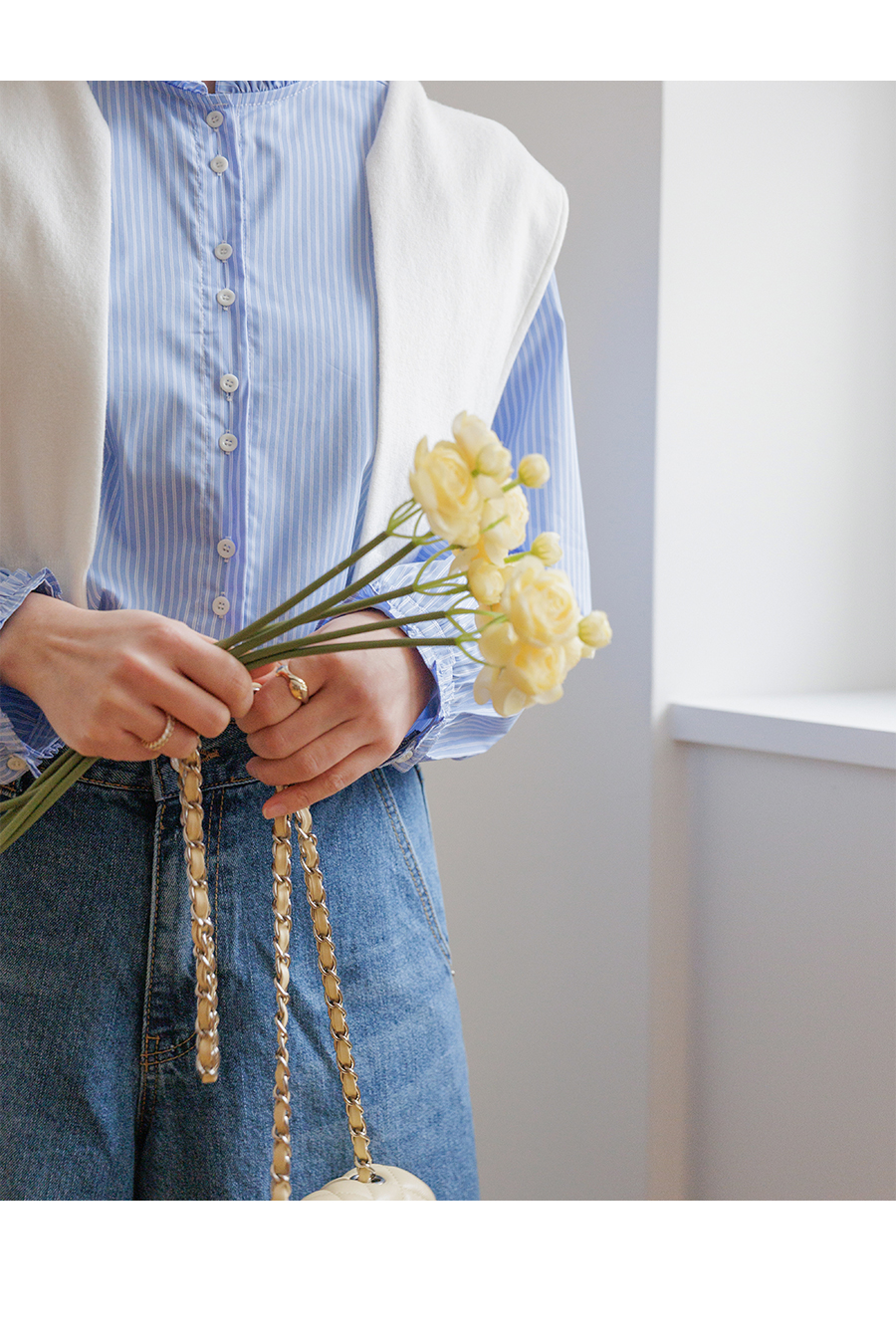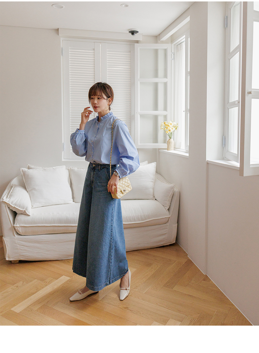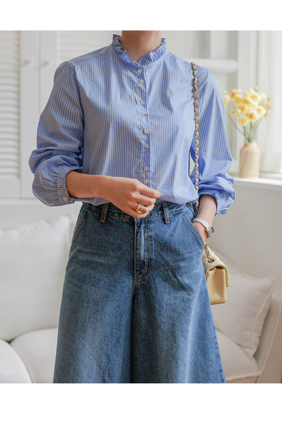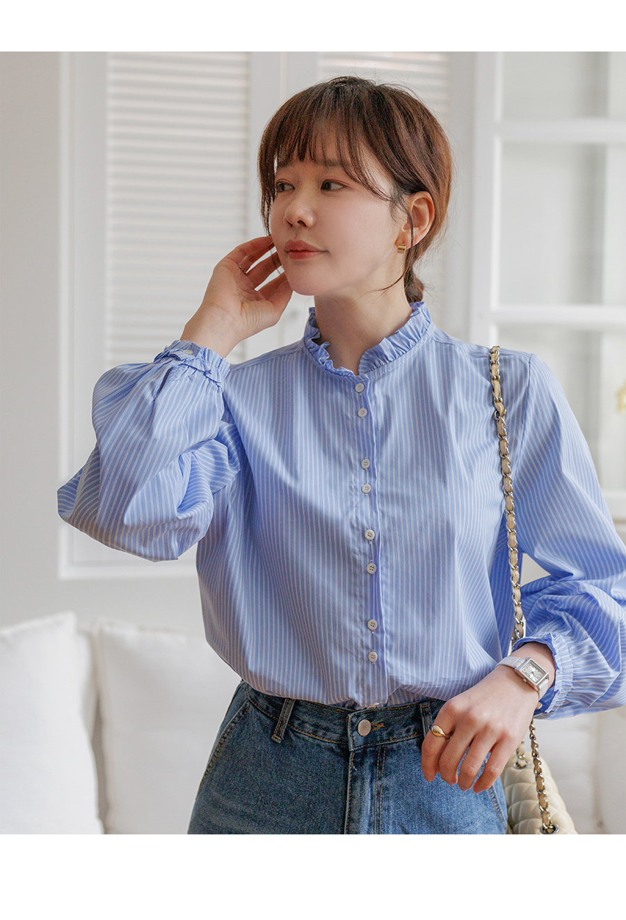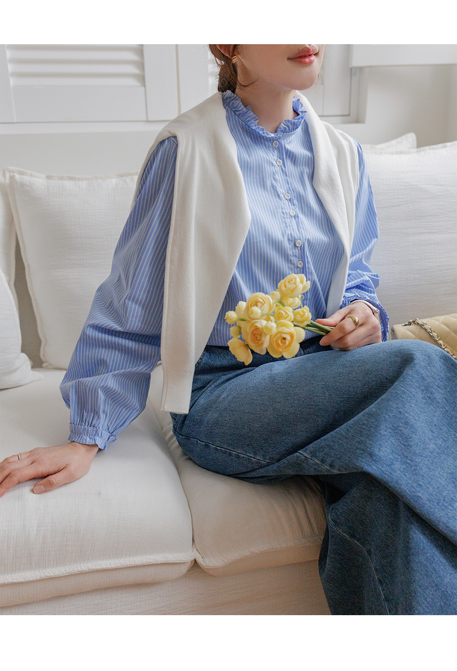 네크라인 프릴 디테일로 러블리한 무드 완성